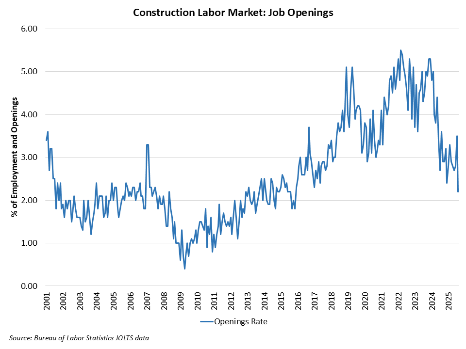The construction job openings rate fell to 2.2% in August, compared to 3.6% the previous year.