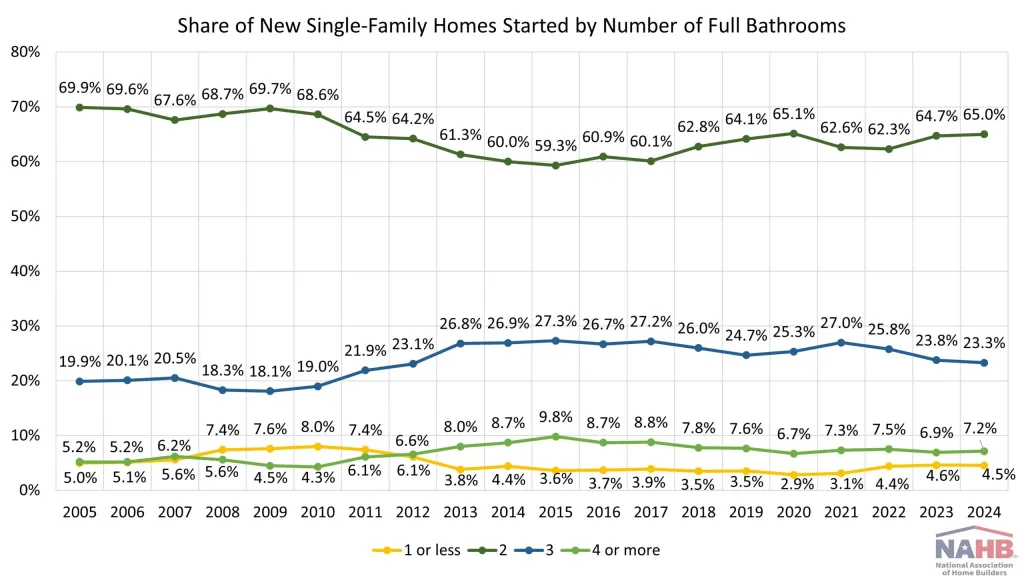 65.0% of new single-family homes built in 2024 had two full bathrooms, indicating the second consecutive year of rise.