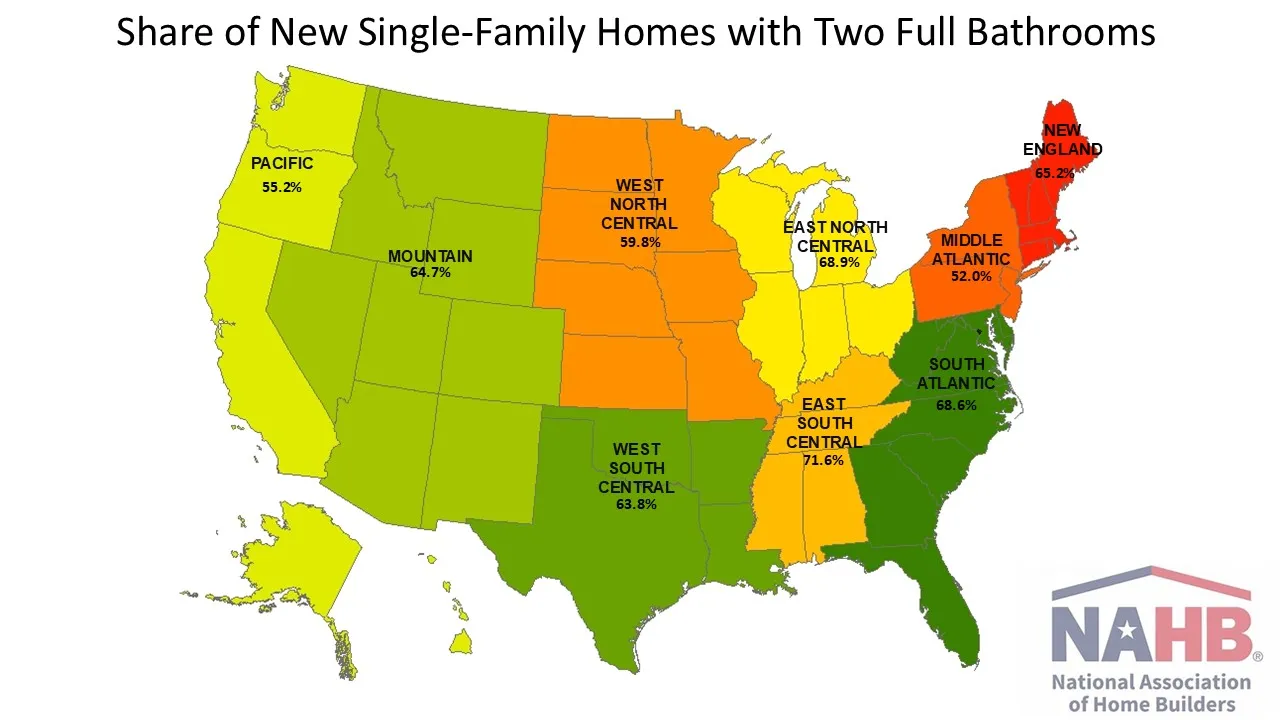 No other division accounted for more than 70%. The Middle Atlantic had the lowest rate, with 52.0% of new single-family homes reporting two full bathrooms.