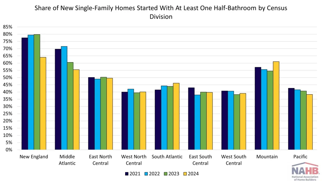 In 2024, 64.0% of new single-family homes built in the New England division featured at least one half-bathroom.