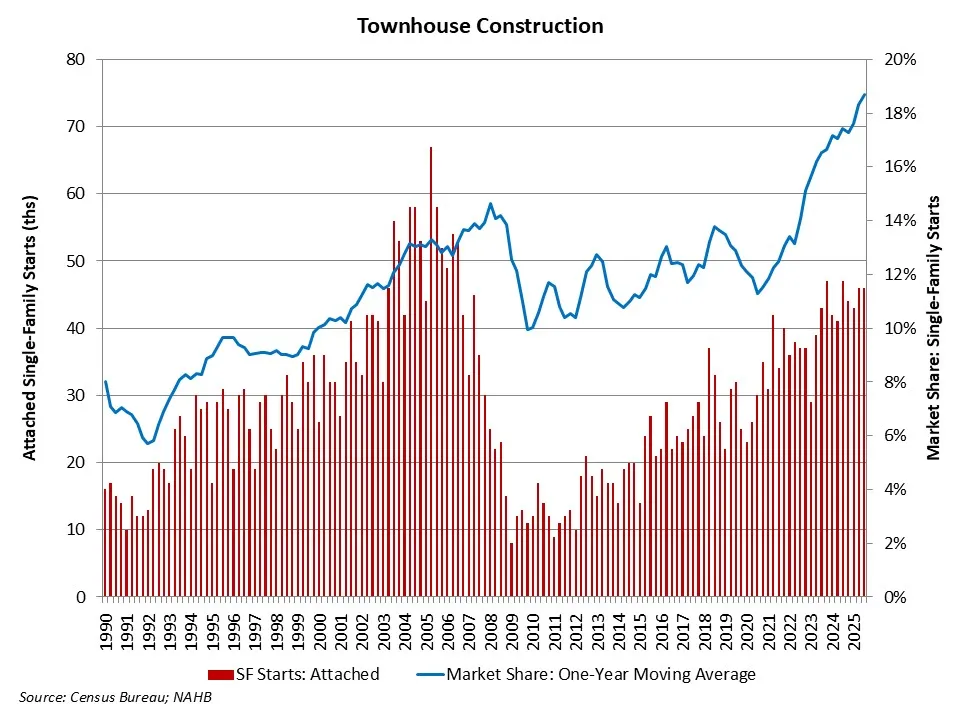 During the third quarter of 2025, townhouse construction increased its proportion of the single-family construction market.
