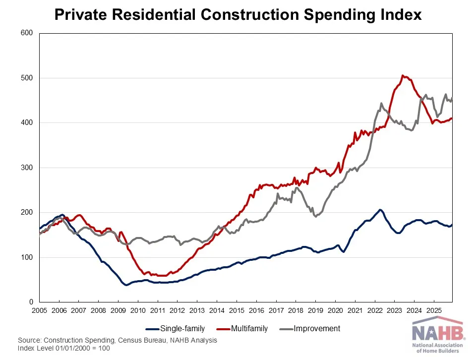 After peaking in July 2023, multifamily construction spending growth has declined, with the index basically plateauing since late 2024.