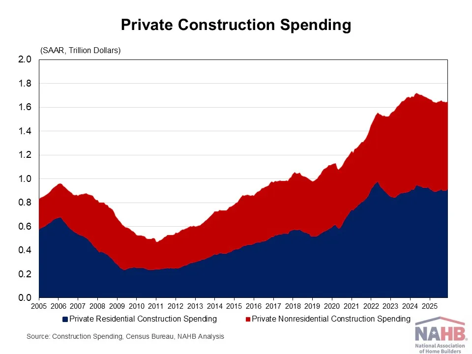 According to the most recent U.S. Census construction spending data, single-family construction spending increased by 1.6% in December, keeping with the NAHB/Wells Fargo Housing Market Index’s (HMI) low builder optimism.
