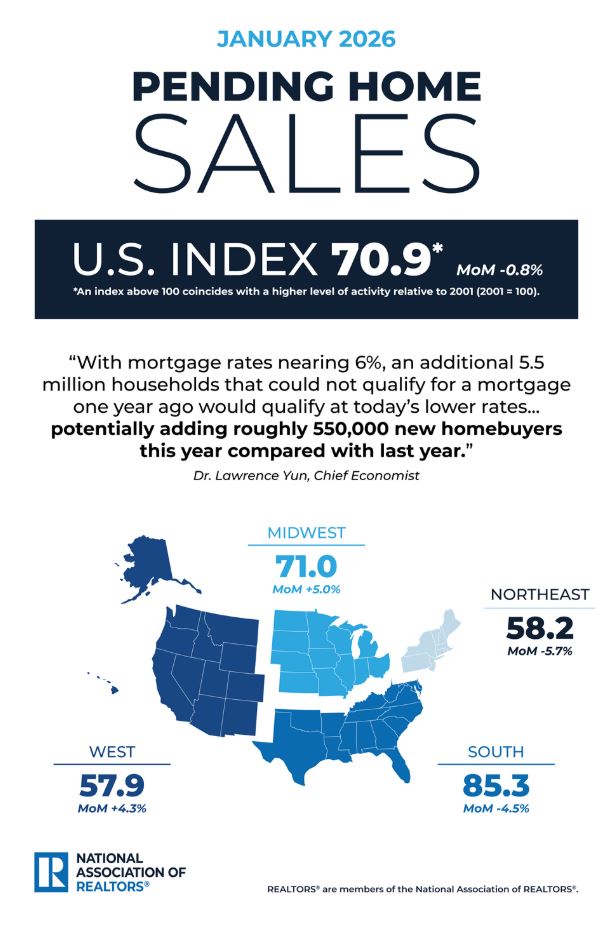 January 2026 National Pending Home Sales are down 0.8% month over month and 0.4% year over year.